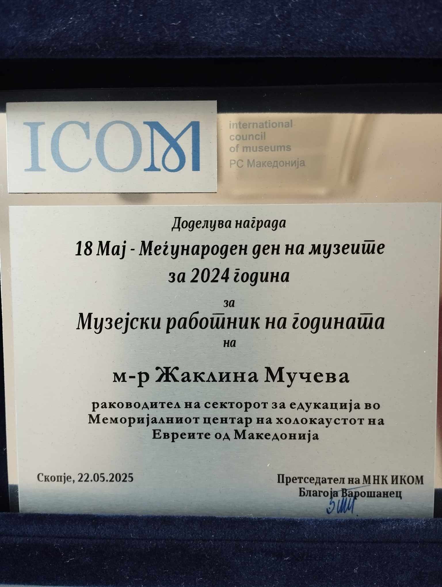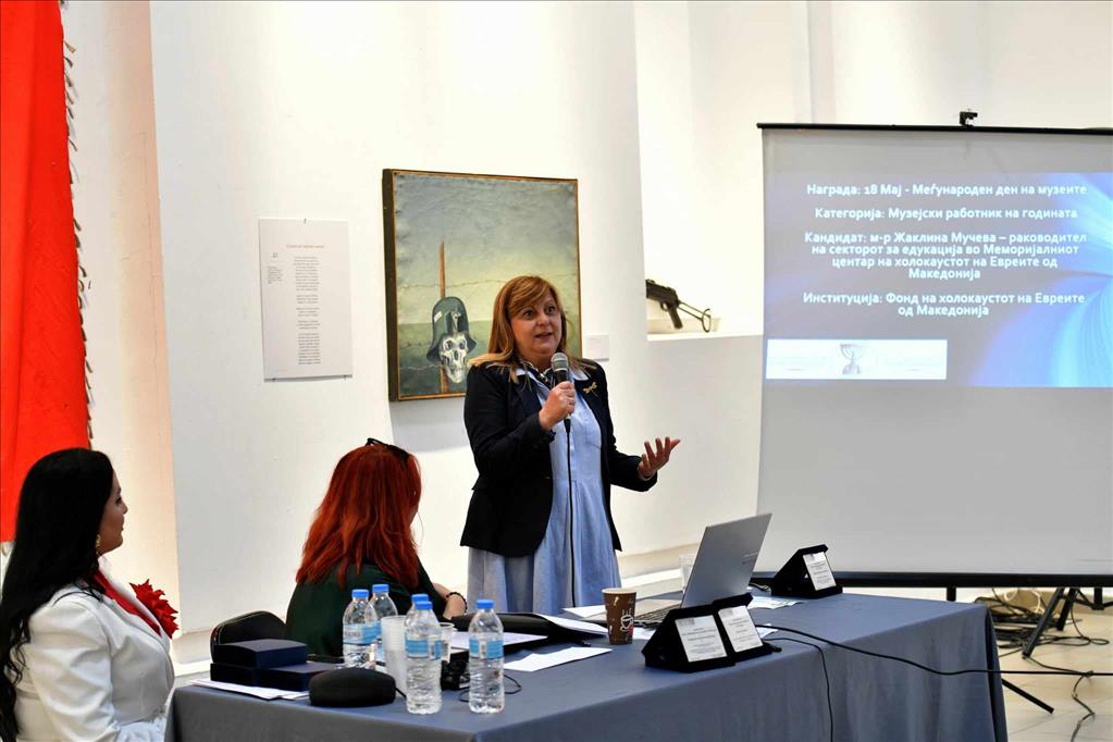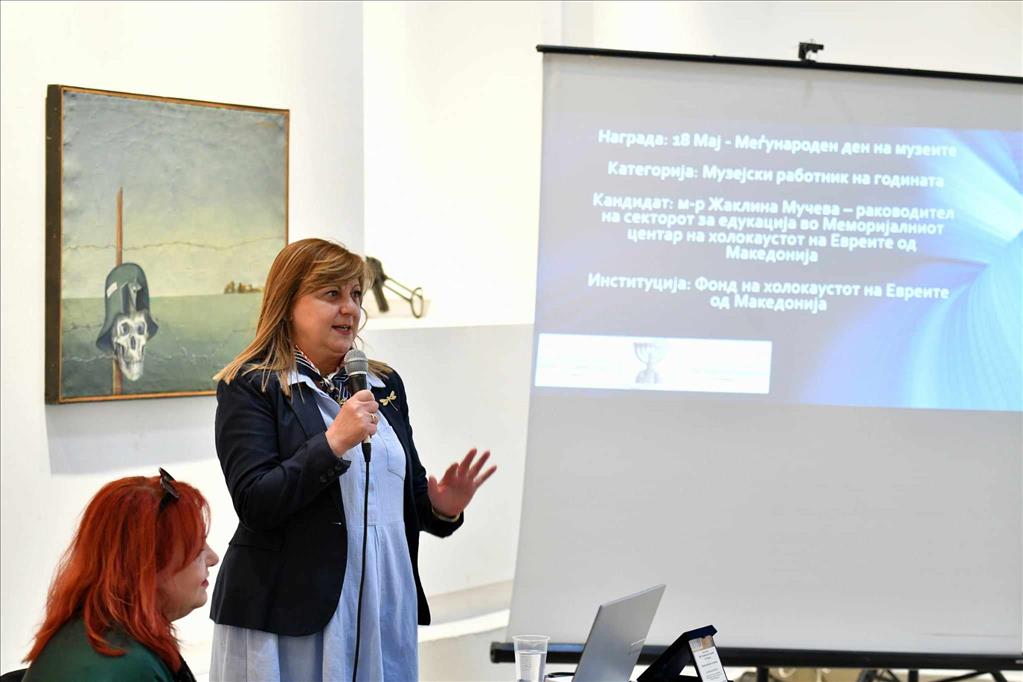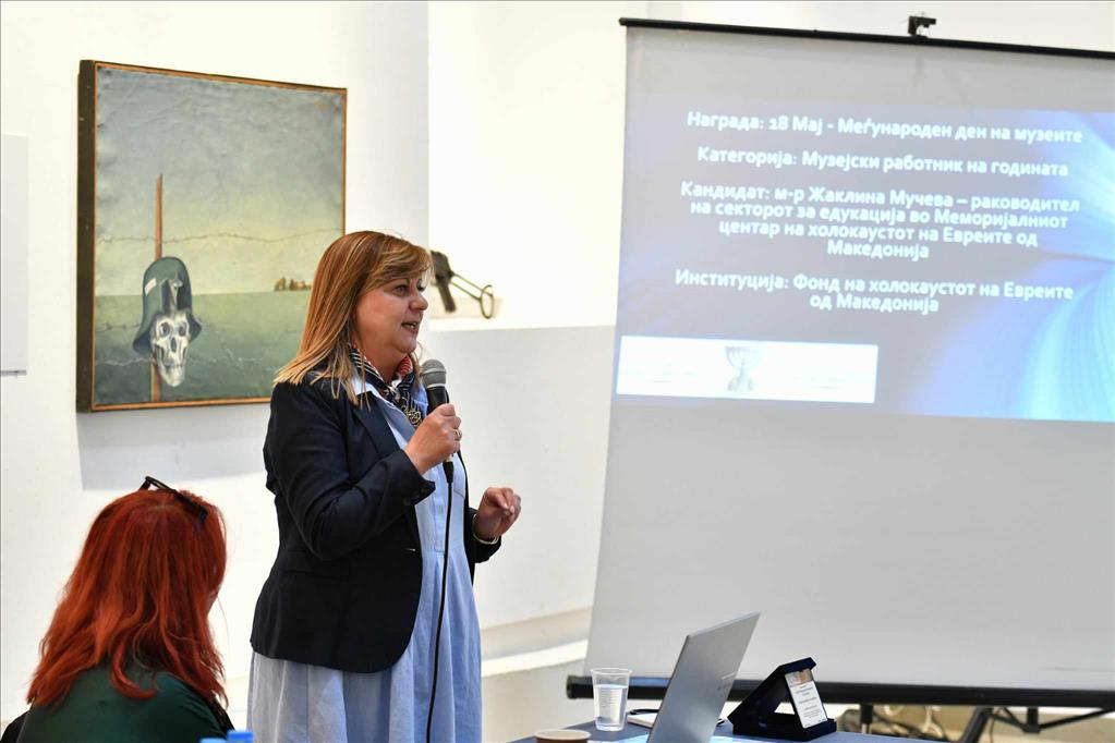 Наградата - Музејски работник на годината ја доби м-р Жаклина Мучева, раководител на секторот за едукација во Меморијалниот центар на холокаустот на Евреите од Македонија;