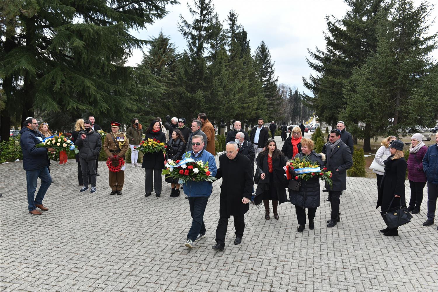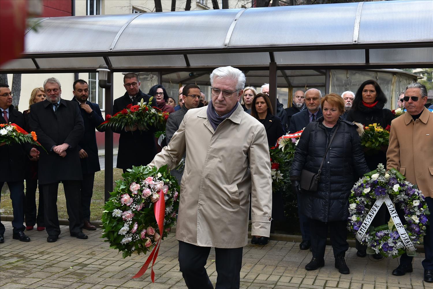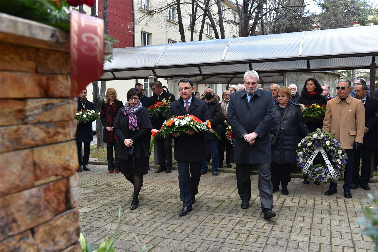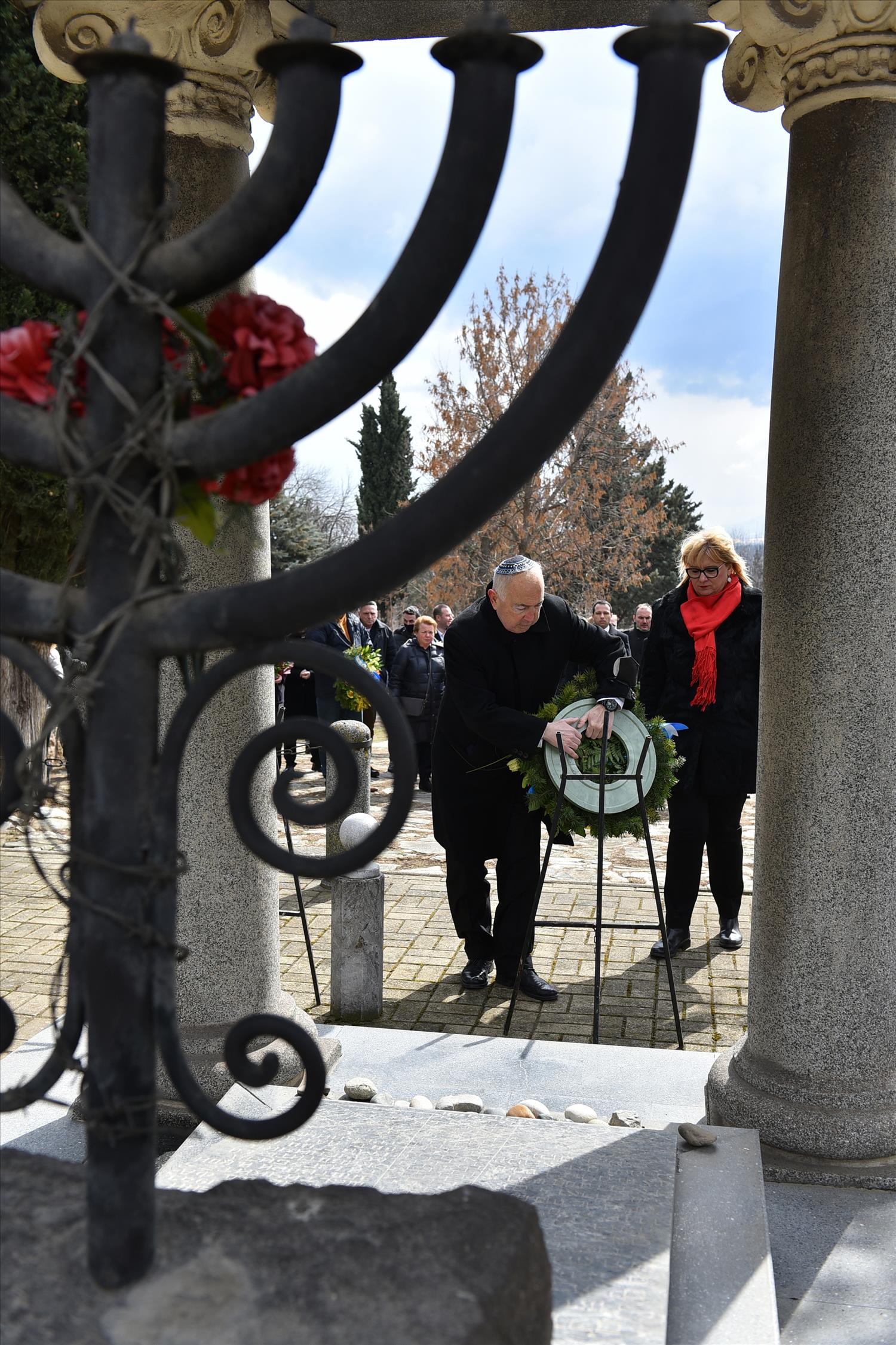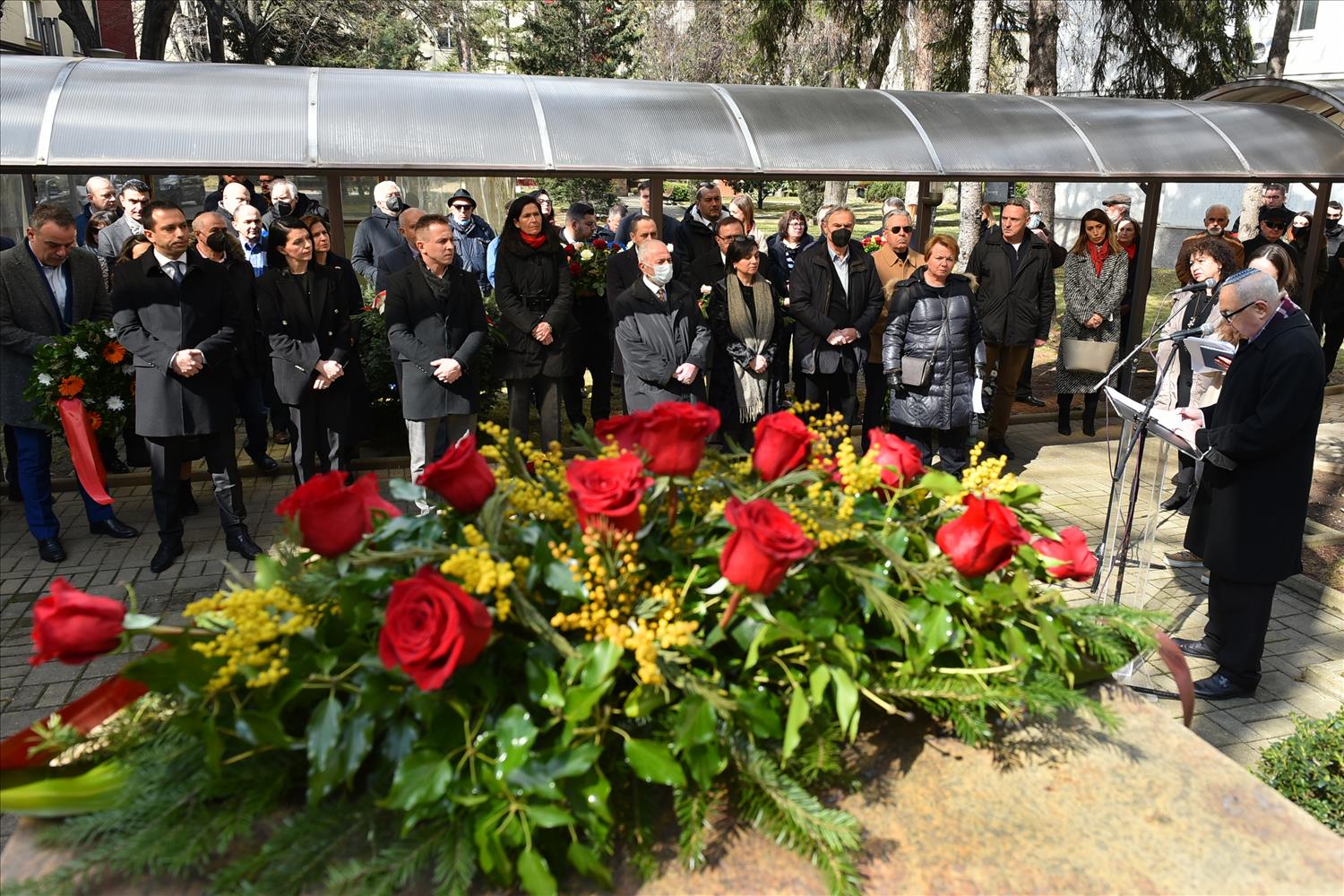 Делегации од Еврејската заедница, претставници на Владата, дипломатскиот кор, невладиниот сектор, пријатели на заедницата и граѓани положија цвеќе пред Споменикот на депортираните македонски Евреи во некогашниот скопски Монопол, кој бил привремен транзитен логор.