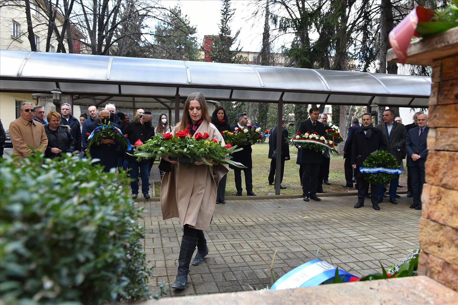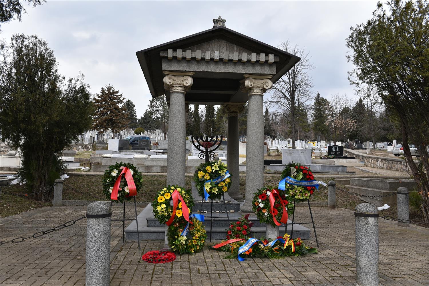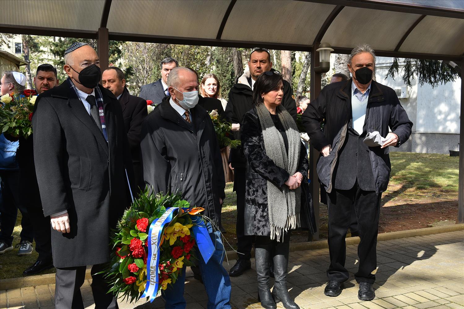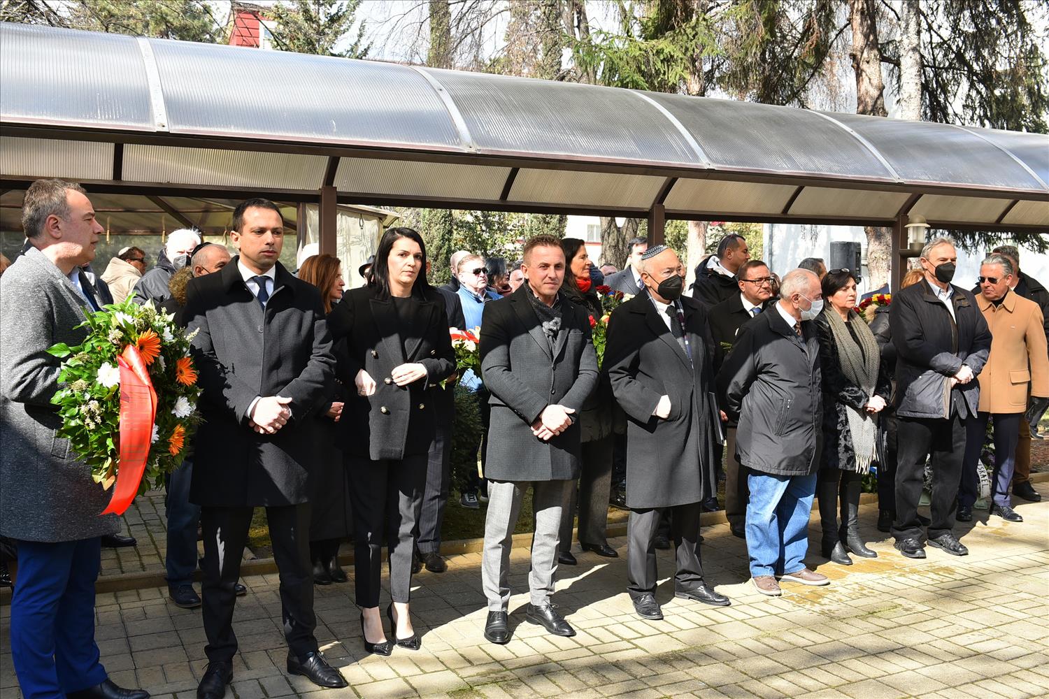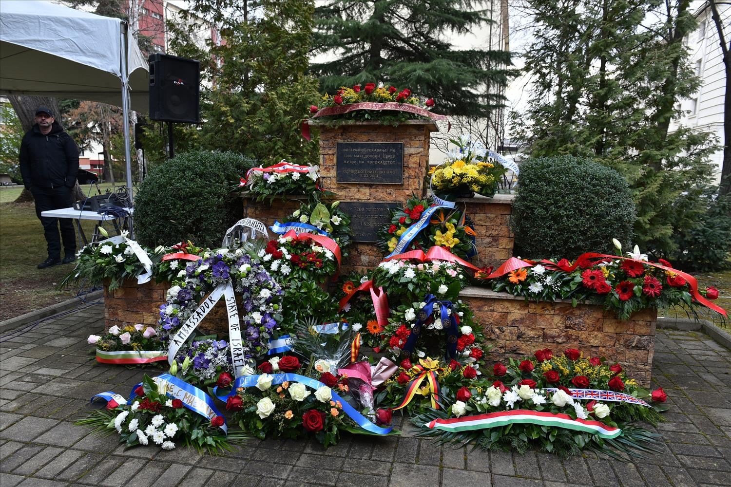 Делегации од Еврејската заедница, претставници на Владата, дипломатскиот кор, невладиниот сектор, пријатели на заедницата и граѓани положија цвеќе пред Споменикот на депортираните македонски Евреи во некогашниот скопски Монопол, кој бил привремен транзитен логор.