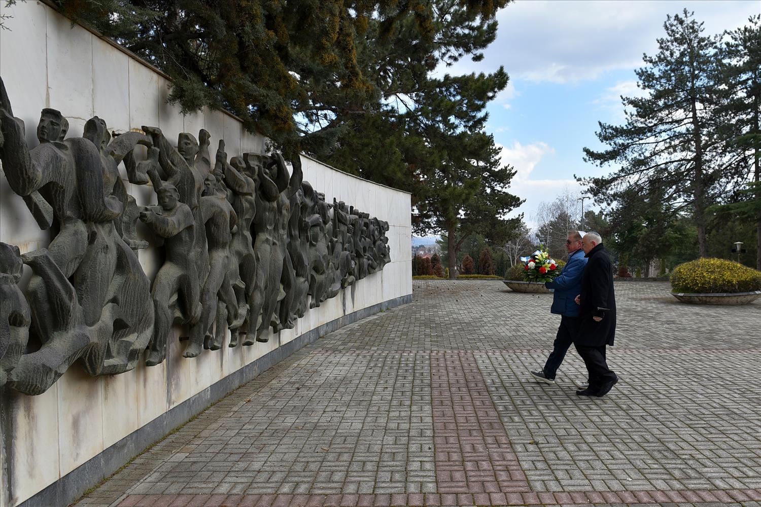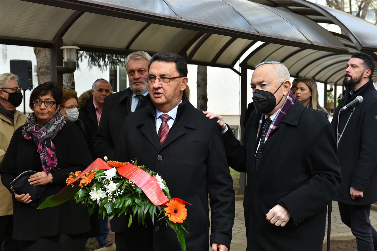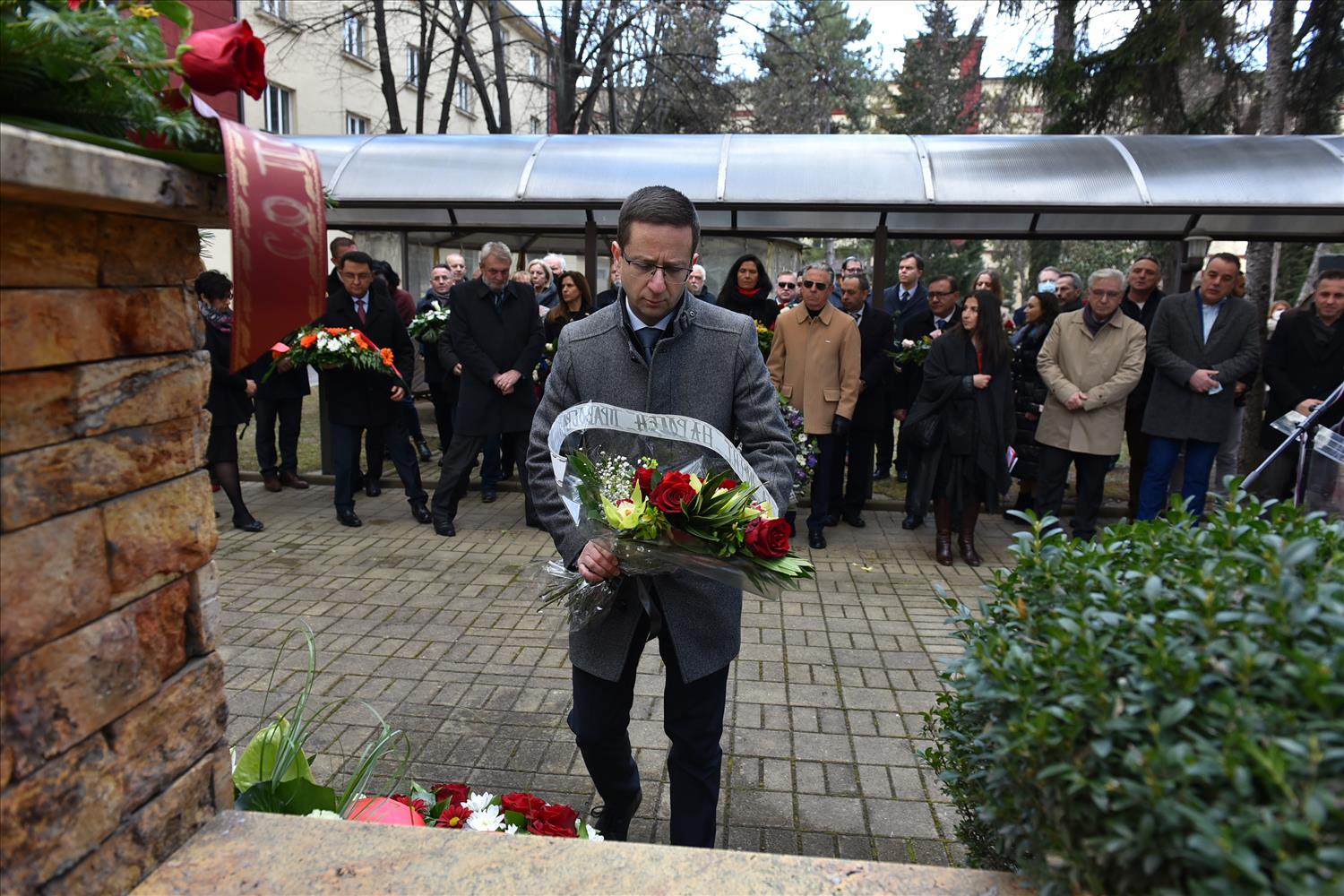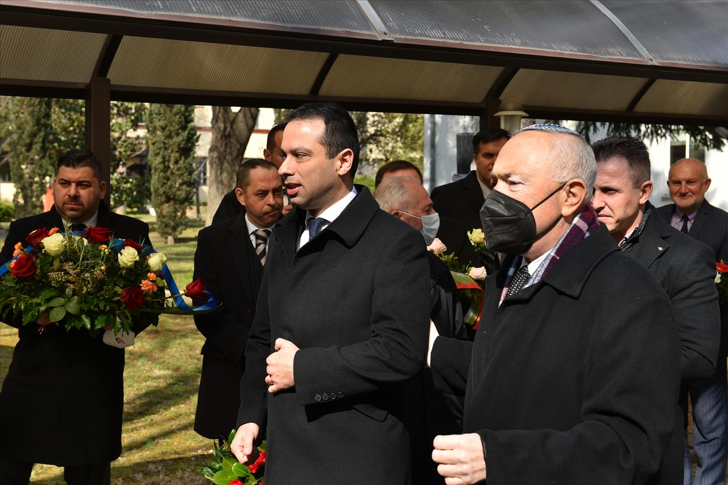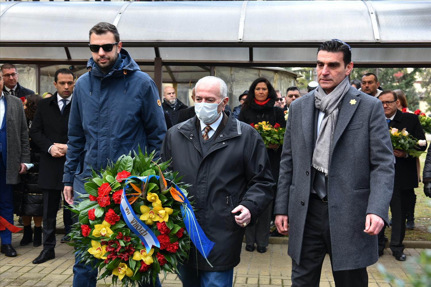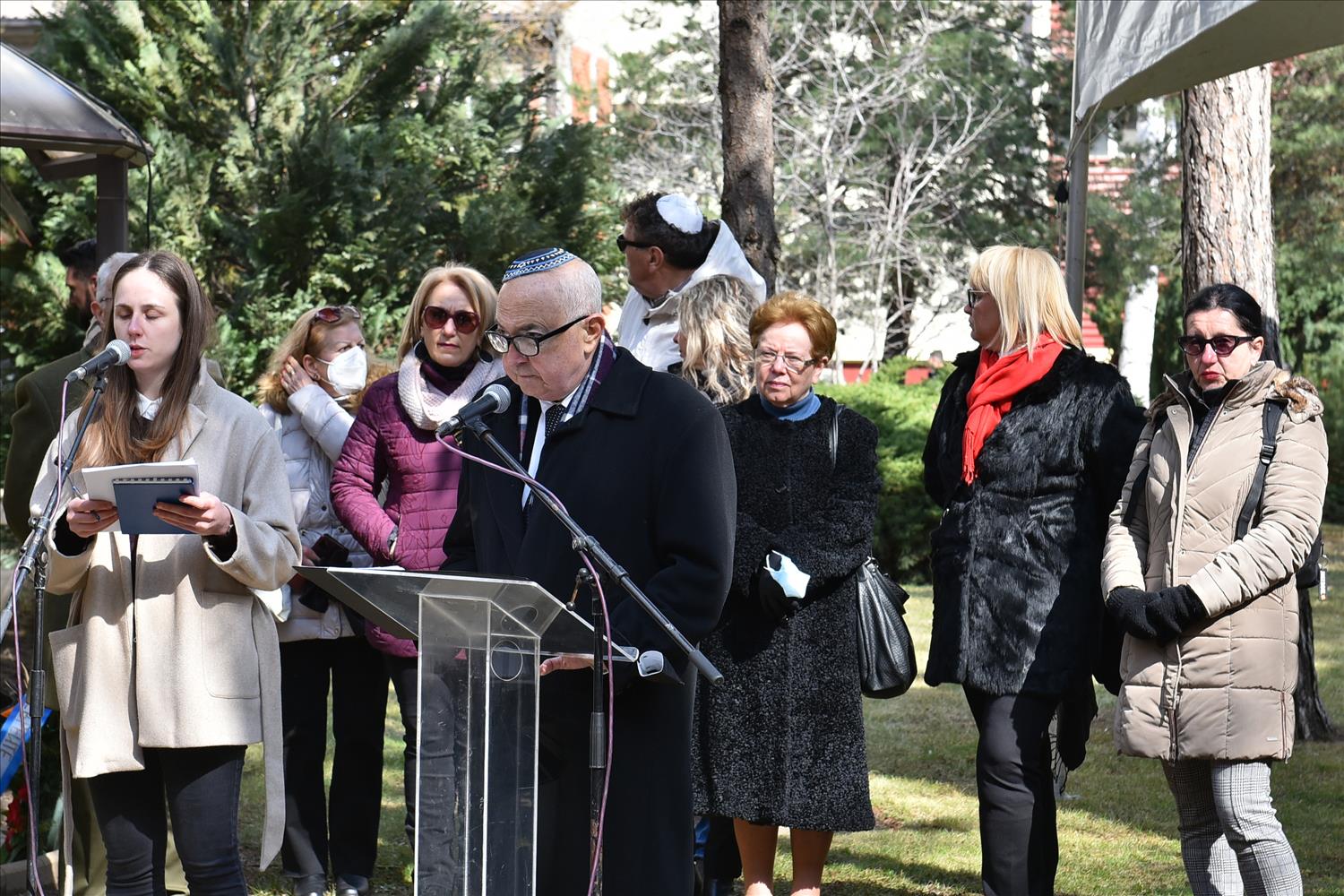 Делегации од Еврејската заедница, претставници на Владата, дипломатскиот кор, невладиниот сектор, пријатели на заедницата и граѓани положија цвеќе пред Споменикот на депортираните македонски Евреи во некогашниот скопски Монопол, кој бил привремен транзитен логор.