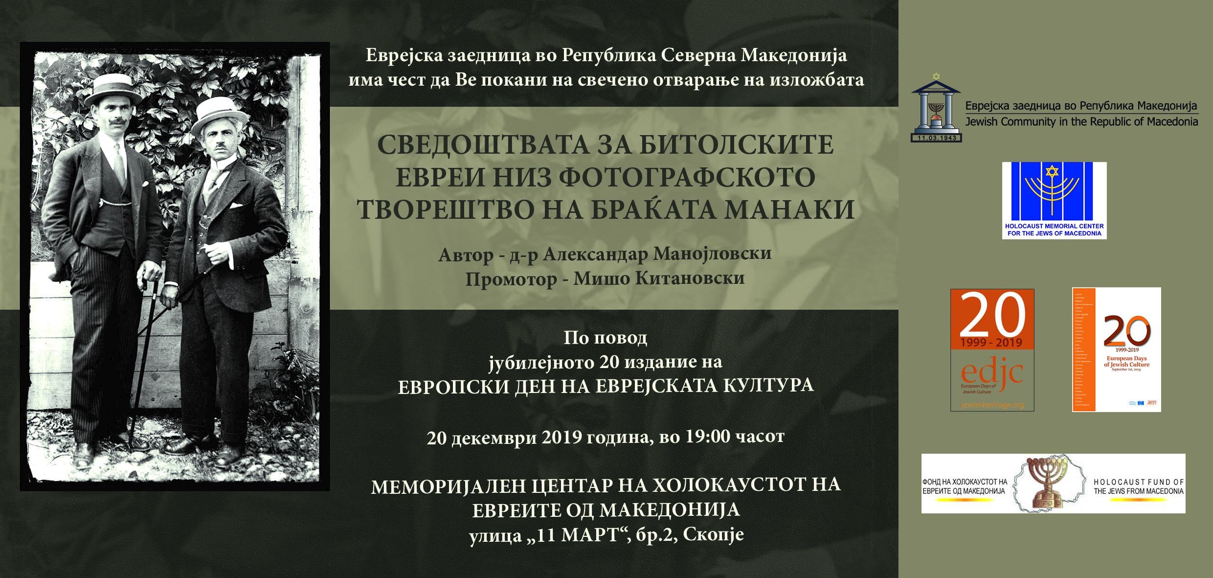 Во Меморијалниот центар на холокаустот на Евреите од Македонија, а во организација на Еврејската зедница отворена е изложба на фотографии кои сведочат за животот на сефардската Еврејска заедница во Битола до Втората светска војна. Автор на изложбата е д-р Александар Манојловски, а промотор, новинарот и публицист Мишо Китановски. Повод за ова фотографско навраќање е 20 годишнината од Европските денови на Еврејска култура и 75 години од обновување на работата на Еврејската заедница во Македонија.